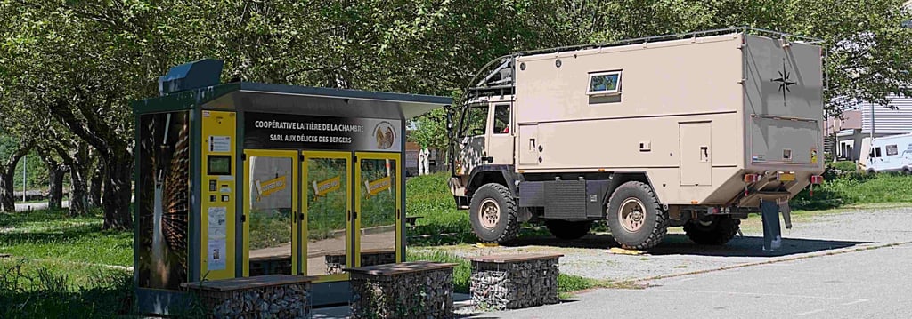 We staan op een bijna verlaten camperplaats naast een kaasautomaat van de Coöperative Laitière de La Chambre. Natuurlijk kopen we hier kaas.