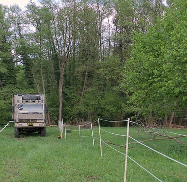 We staan op een prachtige bosrijke en zeer rustige camping. Verderop in het bos staat nog één andere camper. Bij aankomst is het droog maar een dag later regent het bijna de hele dag.