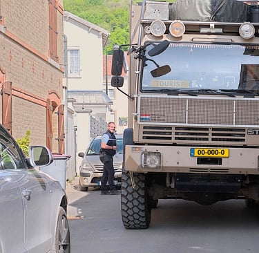 We rijden een mooie route door de Jura. Soms zijn wegen afgesloten en rijden we door erg kleine gehuchtjes waar we met Bulletje maar net passen.