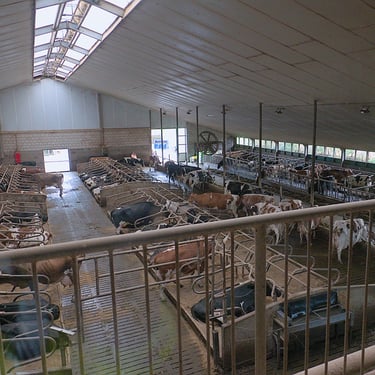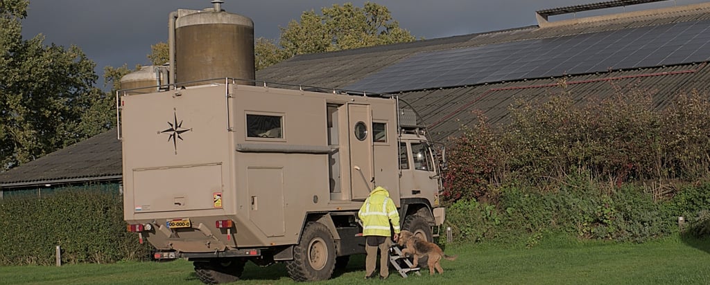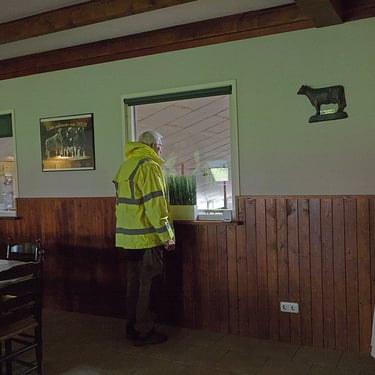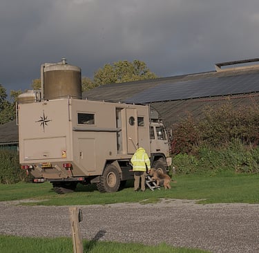 We staan bij een melkveebedrijf. Bijzonder is dat ze een 'skybox' hebben van waaruit je boven op de stal kunt kijken. Het regent vandaag veel maar we maken toch nog een wandeling waarbij de zon soms schijnt. De wandeling verloopt iets anders dan gepland omdat een klompenpad verboden is voor honden.