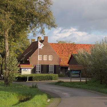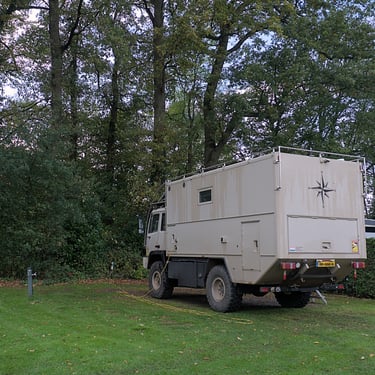 We staan op een camping-klompenmakerij waar veel stacaravans staan. De omgeving is mooi maar het weer werkt niet mee. Het regent geregeld.