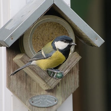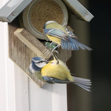 Naast Bulletje staat een stacaravan met een vogelhuisje. Daar komen vogeltjes op af.