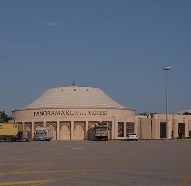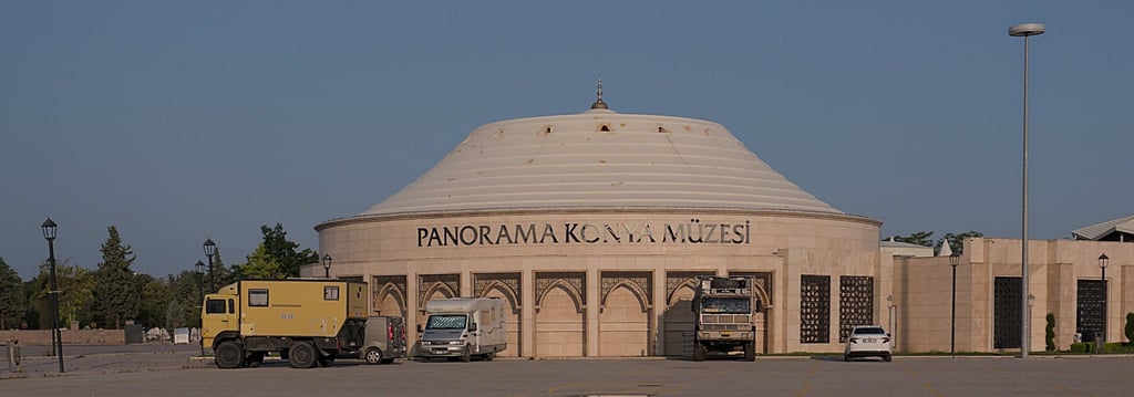 Er staan nog twee andere campers bij het Panorama Konya Museum. De lucht is 's morgens weer blauw en in de stad is het op zondagmorgen rustig.