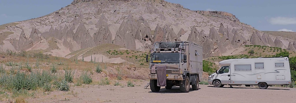 We staan op een bijzondere plek. In het landschap zijn tal van 'schoorstenen', formaties die door regen en wind gevormd zijn. Sommige zijn deels uitgehouwen door mensen. We maken een wandeling naar de rivier. Een hond die bij de camperplaats hoort, wandelt mee. Het blijkt dat veel Turken ook graag bij de rivier zijn. Die proberen met de auto zo dichtbij mogelijk te komen. Dat leidt soms tot problemen want het is een smal, hobbelig paadje. Bij Tinka zie ik eind van de middag een wond aan haar achterpoot. Al een aantal dagen merken we dat er iets aan de hand is. Waarschijnlijk is er toch een grasaar ingekomen.