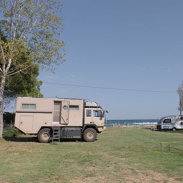 Het roer gaat om. Het oorspronkelijke idee om naar Bulgarije, Roemenië en Hongarije te reizen gooien we overboord. Voor campers zwaarder dan 3,5 ton moet per land een tolkastje gekocht worden. Dat lijkt niet zo eenvoudig. Omdat we niet weer problemen willen met wet- en regelgeving besluiten we om naar Griekenland te reizen. We overnachten bij een prima kleine camping aan de kust. 's Avonds eten we in het restaurantje van de camping. De hond van de camping heeft pups.